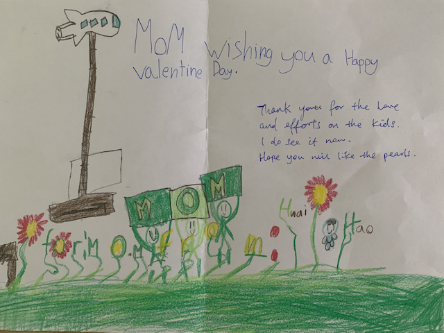 情人节未到,皓皓说了一些关于礼物的话。情人节是大年初三,早上醒来,皓皓要妈妈出来,结果自己走进房里,把这个送给我。Mommy一时口快,说我有了。结果皓皓哭了。问他怎么了?皓皓说,满心期待我收到礼物会很开心,结果我居然说我有珍珠耳环了。他好失望。