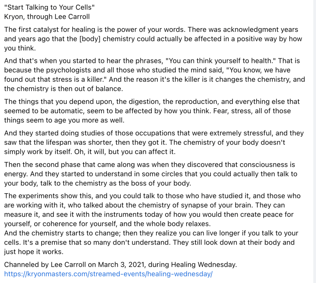 I remembered the note I read the day before, to realign the body and cells with words and intention