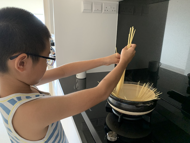 Huaihao is on a spaghetti and cheese streak , loves it so much and would help prepare by slicing the ingredients and doing whatever he can