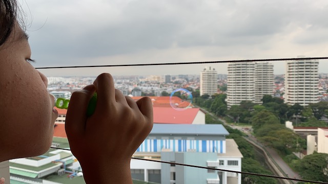This is Qinzhi playing with bubbles out of our window
