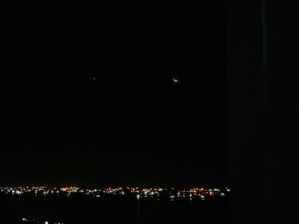 At 630am when we rose, the moon went further right till I had to bend to see it. But in its place when I saw it at 430am, Mars the red planet was there.