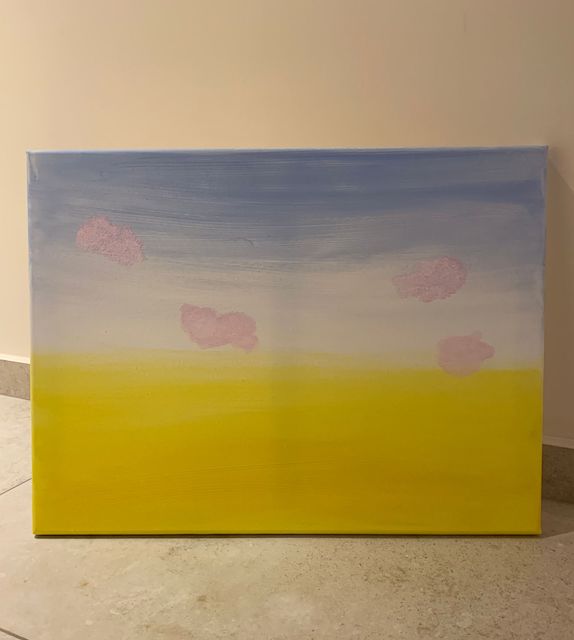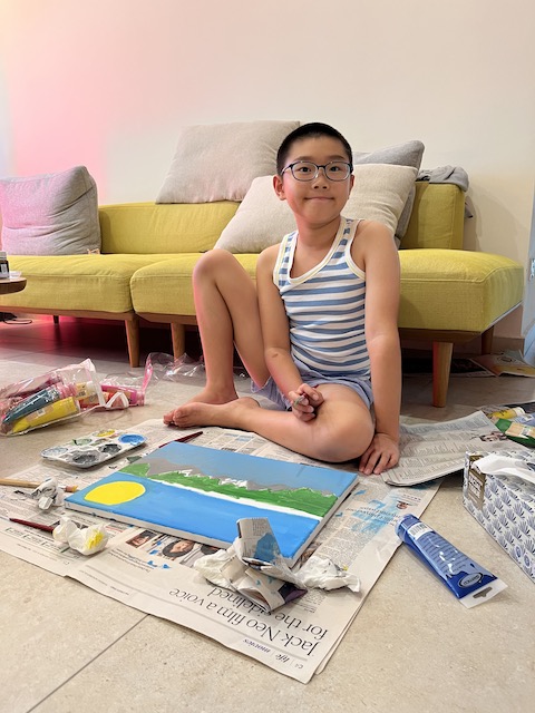 We got some canvas and the kids were preparing something for Karyn ‘s birthday. HuaiHao painted a mountain and pink flowers and he calls this paint it. The mountain and beyond. What a name!