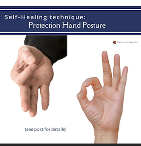 When meditating, I encourage you to hold the protection posture to strengthen your kidney energy after you have had an open hand posture for the first two to three minutes.