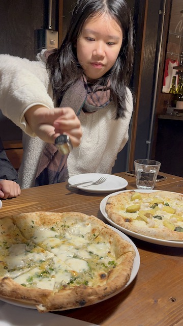 The ones we chose was a vegan tomato based vegetable pizza, with sweet potato and potato . Another one had cheese and shirasu or whitebait and the last one was scallops and potato