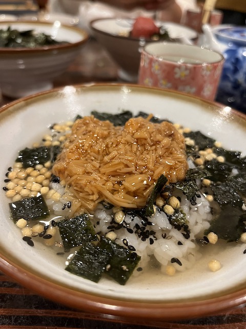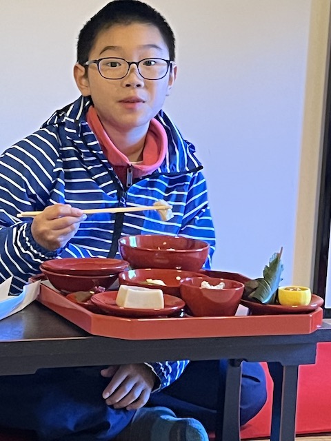 The kids had traditional breakfast course of rice and side dishes of tofu, fish,